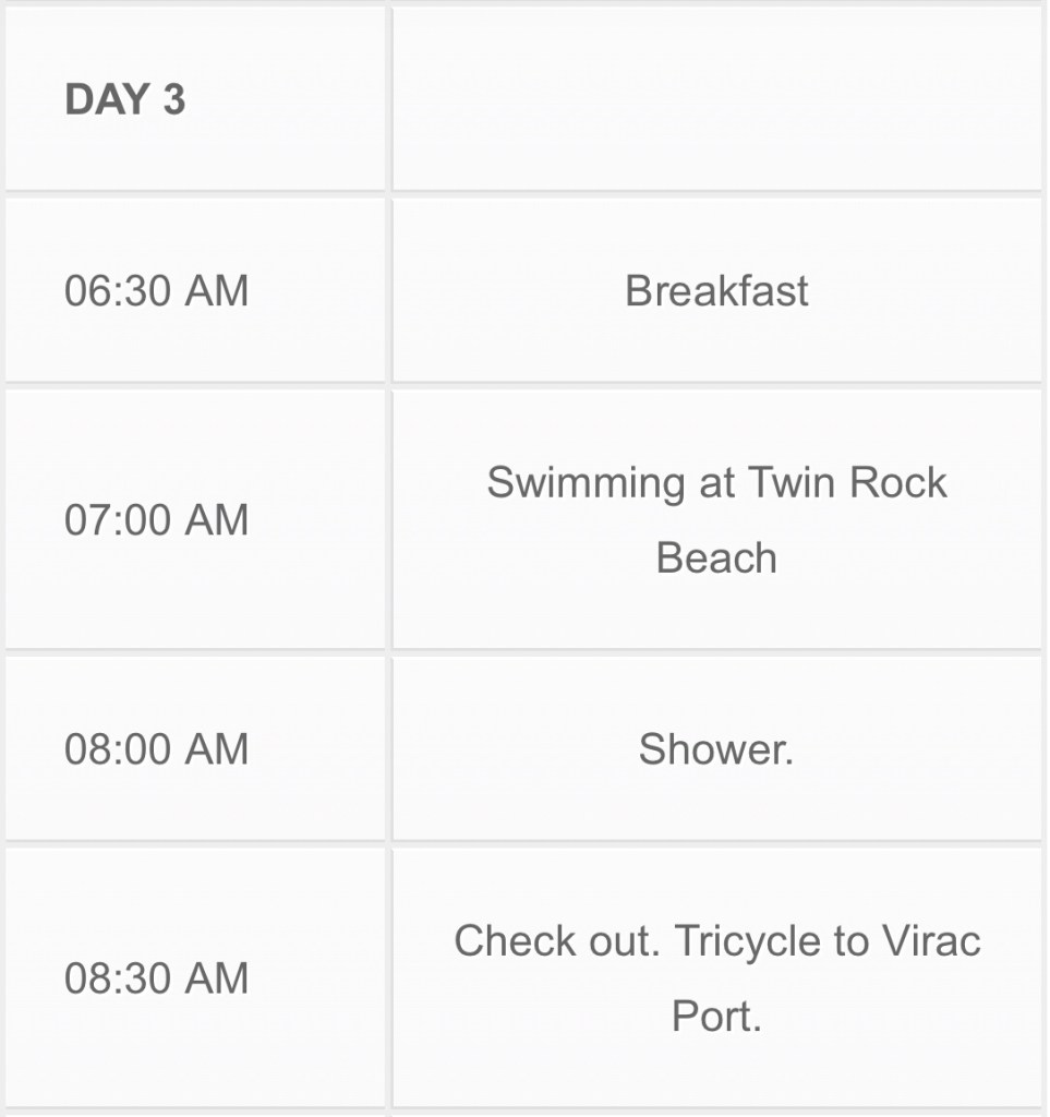 Here’s a sample itinerary for a 3 days 2 nights trip in Catanduanes, perfect for long weekends. If you have limited time and you only have 2 days to spend. I recommend you pick Day 1 and Day 2 on the itinerary. You can just tweak the itinerary depending on your availability and budget.