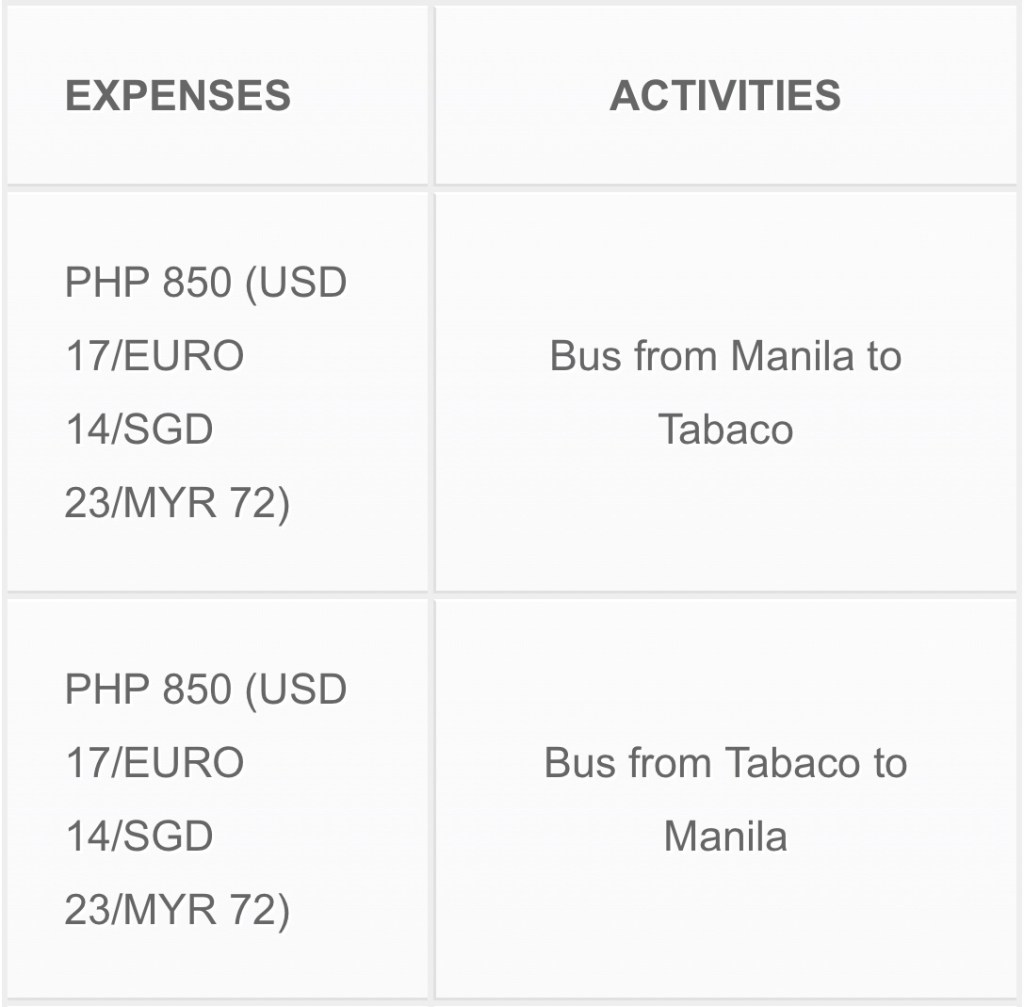 Bus fare for air-conditioned buses ranges from PHP 840 to PHP 1,215 depending on the bus company and type of bus. Non-air-conditioned buses are way cheaper. Travel time is approximately 11 – 12 hours. Click link below for the bus schedules from Manila to Tabaco.