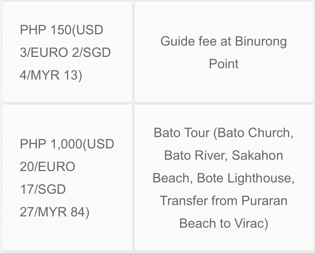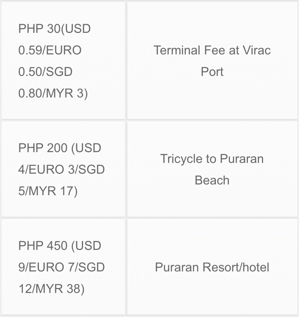 Alternatively, you can ride charter a tricycle to Virac PHP 250 (one way) or look for other passengers to share the chartered tricycle.